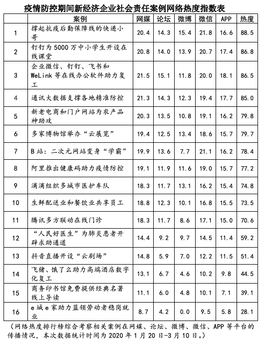 課題組考察在統(tǒng)籌推進(jìn)疫情防控和經(jīng)濟(jì)社會(huì)秩序恢復(fù)中表現(xiàn)突出的互聯(lián)網(wǎng)平臺(tái)案例,根據(jù)其對(duì)經(jīng)濟(jì)社會(huì)生活的實(shí)際影響,以及公眾對(duì)相關(guān)服務(wù)的關(guān)注度和美譽(yù)度,由長(zhǎng)期研究互聯(lián)網(wǎng)新經(jīng)濟(jì)的專(zhuān)家學(xué)者推薦產(chǎn)生“疫情防控期間互聯(lián)網(wǎng)企業(yè)社會(huì)責(zé)任案例”。新經(jīng)濟(jì)是一個(gè)開(kāi)放的賽道,在服務(wù)公眾的賽道上應(yīng)鼓勵(lì)萬(wàn)馬奔騰。本次案例推薦不僅重視BAT等超級(jí)平臺(tái),也適當(dāng)選入一些中小微互聯(lián)網(wǎng)企業(yè),點(diǎn)贊其服務(wù)經(jīng)濟(jì)民生的創(chuàng)新嘗試。