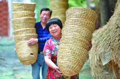 山東臨沂市郯城縣馬頭鎮草編合作社社員在搬運用秸稈編制的工藝品