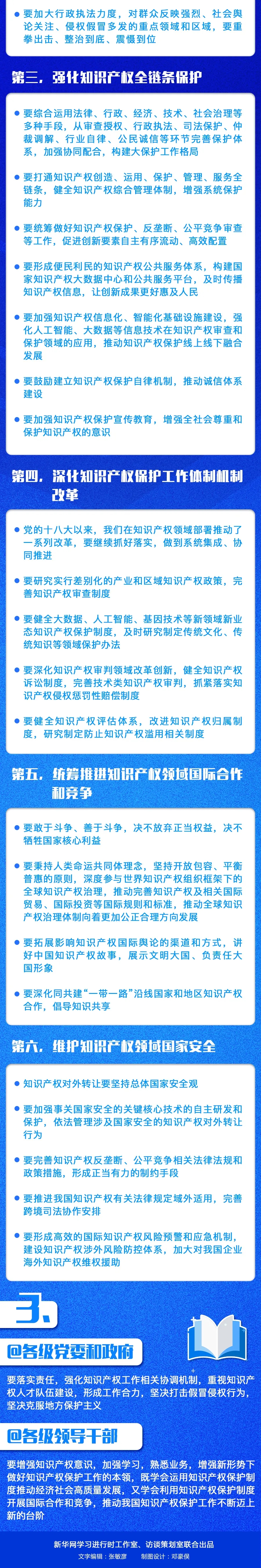 知識產權保護是一個系統工程,覆蓋領域廣、涉及方面多,要綜合運用法律、行政、經濟、技術、社會治理等多種手段,從審查授權、行政執法、司法保護、仲裁調解、行業自律、公民誠信等環節完善保護體系,加強協同配合,構建大保護工作格局。要打通知識產權創造、運用、保護、管理、服務全鏈條,健全知識產權綜合管理體制,增強系統保護能力。要統籌做好知識產權保護、反壟斷、公平競爭審查等工作,促進創新要素自主有序流動、高效配置。要形成便民利民的知識產權公共服務體系,構建國家知識產權大數據中心和公共服務平臺,及時傳播知識產權信息,讓創新成果更好惠及人民。要加強知識產權信息化、智能化基礎設施建設,強化人工智能、大數據等信息技術在知識產權審查和保護領域的應用,推動知識產權保護線上線下融合發展。要鼓勵建立知識產權保護自律機制,推動誠信體系建設。要加強知識產權保護宣傳教育,增強全社會尊重和保護知識產權的意識。