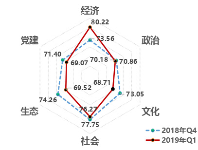 2.從領域來看,經濟領域改革熱度一直較高。經濟80.22,政治70.18,文化68.71,社會76.27,生態69.52,黨建69.07。六大領域除經濟領域外,政治、文化、社會、生態、黨建領域均比2018年第4季度有所下降,其中生態領域下降4.73,降幅6.37%。從連續八個季度評估結果來看,相對其它領域,經濟領域改革熱度指數處于高位,社會領域次之,文化領域的改革熱度指數低位運行。