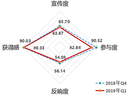 3.從維度來看,反響度呈現上升趨勢。宣傳度63.67,參與度82.68,反響度54.08,獲得感89.33。2019年第1季度,四大維度均比2018年第4季度有所下滑,其中參與度下降達7.84。從連續八個季度評估結果來看,反響度在穩步提升,說明公眾在積極主動關注、討論各項改革。