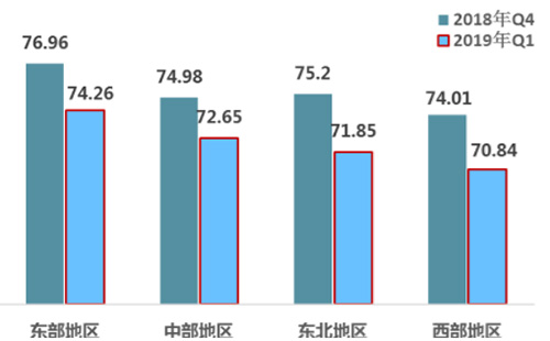 1.從區域來看,東部地區高于西部地區。一季度東部、中部、東北、西部的改革熱度指數分別為74.26、72.65、71.85、70.84,比2018年第4季度均有所下降。其中,東北地區的降幅最大,達到4.45%。從連續八個季度評估結果來看,改革熱度指數呈現出地域特征,東部地區最高,西部地區最低,兩者之間的差距呈現不斷縮小的趨勢。