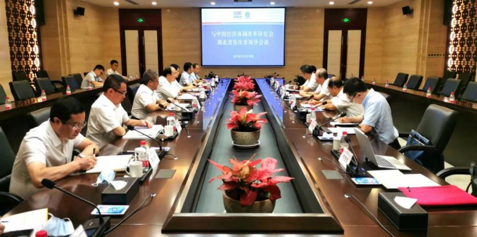 調研期間,彭森會長一行在湖北省發改委組織召開專題座談會。省發改委、經信廳、財政廳、生態環境廳、國資委、市場監管局、武漢市發改委以及省文化旅游投資集團有限公司,武漢商貿國有控股集團有限公司等單位負責同志參加座談會并介紹相關情況。