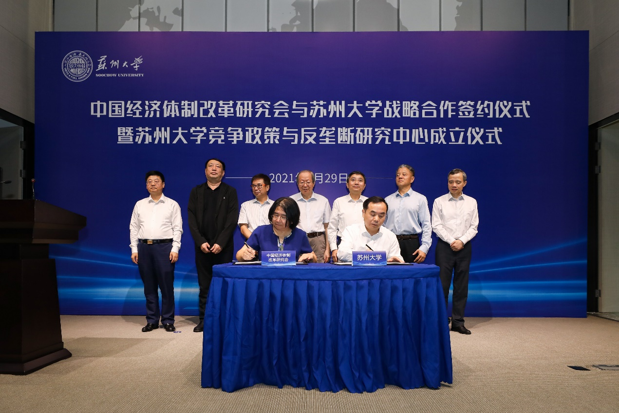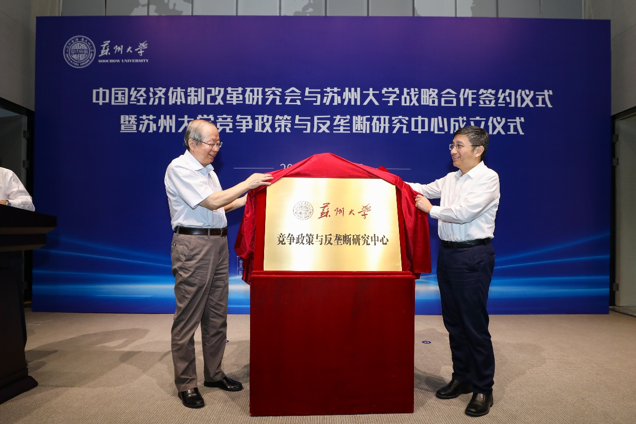 9月29日上午,彭森會長出席了中國經濟體制改革研究會與蘇州大學共同舉辦的戰略合作協議簽署暨蘇州大學競爭政策與反壟斷研究中心揭牌儀式。蘇州大學黨委書記江涌代表蘇州大學致歡迎辭,彭森會長、江蘇省市場監管局陳琪宏副局長、蘇州市副市長楊知評為會議致辭。