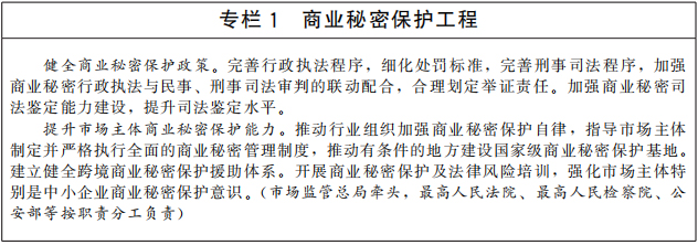 健全知識(shí)產(chǎn)權(quán)法律法規(guī)。開展知識(shí)產(chǎn)權(quán)基礎(chǔ)性法律研究。統(tǒng)籌推進(jìn)專利法、商標(biāo)法、著作權(quán)法、反壟斷法、科學(xué)技術(shù)進(jìn)步法、電子商務(wù)法等相關(guān)法律法規(guī)的修改完善。加強(qiáng)地理標(biāo)志、商業(yè)秘密等領(lǐng)域立法,出臺(tái)商業(yè)秘密保護(hù)規(guī)定。完善集成電路布圖設(shè)計(jì)法規(guī)。推進(jìn)修訂植物新品種保護(hù)條例。制定中醫(yī)藥傳統(tǒng)知識(shí)保護(hù)條例。完善與國(guó)防建設(shè)相銜接的知識(shí)產(chǎn)權(quán)法律制度。全面建立并實(shí)施知識(shí)產(chǎn)權(quán)侵權(quán)懲罰性賠償制度,加大損害賠償力度。研究建立健全符合知識(shí)產(chǎn)權(quán)審判規(guī)律的特別程序法律制度。適應(yīng)科技進(jìn)步和經(jīng)濟(jì)社會(huì)發(fā)展需要,依法及時(shí)推動(dòng)知識(shí)產(chǎn)權(quán)法律法規(guī)立改廢釋。(中央宣傳部、最高人民法院、最高人民檢察院、科技部、工業(yè)和信息化部、司法部、農(nóng)業(yè)農(nóng)村部、商務(wù)部、國(guó)家衛(wèi)生健康委、市場(chǎng)監(jiān)管總局、國(guó)家國(guó)防科工局、國(guó)家林草局、國(guó)家中醫(yī)藥局、國(guó)家知識(shí)產(chǎn)權(quán)局、中央軍委裝備發(fā)展部等按職責(zé)分工負(fù)責(zé))