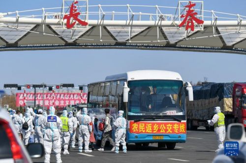 在吉林長春高速公路東出口,返鄉農民登上返鄉公交專線(4月12日攝)。新華社發