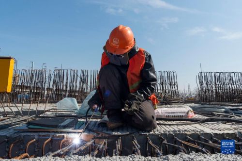 4月3日,在哈爾濱市道外區,工人在中鐵一局北門街高架工程施工現場作業。新華社記者 謝劍飛 攝
