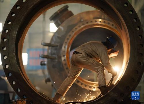 4月14日,在哈電集團哈爾濱鍋爐廠有限責任公司車間,工人進行生產作業。新華社記者 王建威 攝