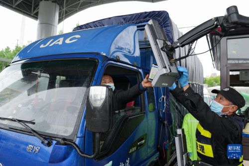 4月13日,在合肥百大周谷堆大興農產品物流園,司機在智能化門禁系統上掃碼進入。該園建立集測溫、核驗安康碼、數據收集等功能的智能化門禁系統,進場駕乘人員不用下車即可快速核驗,實現防疫測溫智能化、人車追溯數據化。新華社記者 杜宇 攝
