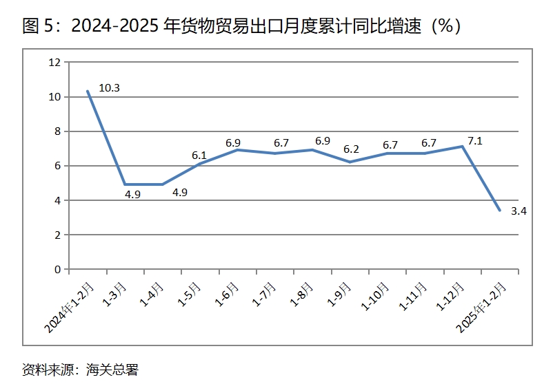 (二)貨物出口增速由升轉落。1-2月份,貨物出口同比增長3.4%,比上年1-12月份增長7.1%回落3.7個百分點,1-12月份比1-11月份回升0.4個百分點,呈現出增速由升轉落的態勢。貨物出口對主要貿易出口經濟體增速全面回落,1-2月份對歐盟出口增長1.8%,比上年1-12月月份回落2.5個百分點;對美國出口增長3.4%,比1-12月份回落2.7個百分點;對東盟出口增長6.8%,比1-12月份回落6.6個百分點;對拉丁美洲出口增長4.4%,比1-12月份回落10.0個百分點。