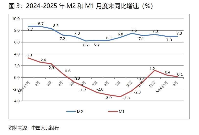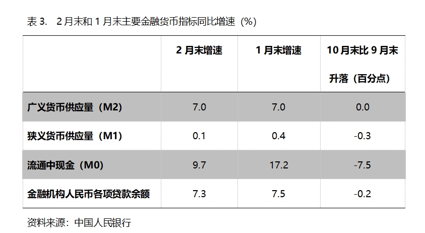 (三)M2增速由落轉平。2月末,廣義貨幣供應量(M2)同比增長7.0%,與1月末增長7.0%持平,1月末增速比上年12月末增速回落了0.3個百分點;狹義貨幣供應量(M1)增速持續回落,2月末同比增長0.1%,比1月末增長0.4%回落0.3個百分點,而1月末增幅比上年12月末增幅回落0.8個百分點;流通中貨幣(M0)增速由升轉落,2月末同比增長9.7%,比1月末增長17.2%回落了7.5個百分點,而1月末增速比上年12月末增速回升了4.2個百分點。按照貨幣政策適度寬松的要求,貨幣供應量增速存在著提速的必要。