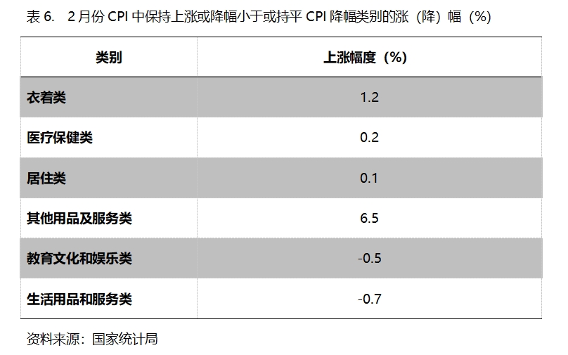 CPI中保持上漲的類別共4類,即衣著類價格同比上漲1.2%,醫療保健類上漲0.2%,居住類上漲0.1%,其他用品和服務類上漲6.5%;降幅小于或持平CPI降幅的類別共2類,即教育文化和娛樂類下降0.5%,生活用品及服務下降0.7%。