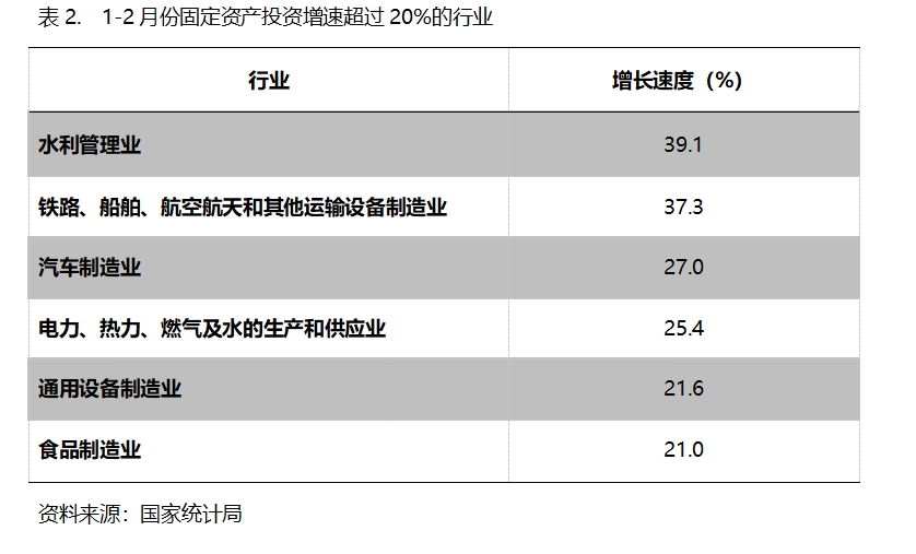 1-2月份,固定資產投資增速超過20%的主要行業共6個,即水利管理業增長39.1%,鐵路、船舶、航空航天和其他運輸設備制造業增長37.3%,汽車制造業增長27.0%,電力、熱力、燃氣及水的生產和供應業增長25.4%,通用設備制造業增長21.6%,食品制造業增長21.0%。