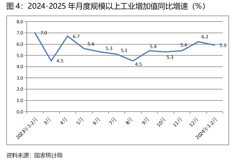 (一)工業增速由升轉落。1-2月份,規模以上工業增加值同比增長5.9%,比上年12月份增長6.2%回落了0.3個百分點,上年12月份比上年11月份回升了0.8個百分點。1-2月份工業增速出現回落,有上年同期高基數的因素,如按兩年平均增速計算,增速為6.4%,說明規模以上工業出現了積極的回升勢頭。值得關注的是,在全部規模以上工業增速回落的同時,規模以上制造業和私營企業增速卻保持了回升,1-2月份規模以上制造業同比增速比上年12月份回升0.5個百分點,私營企業回升1.4個百分點。
