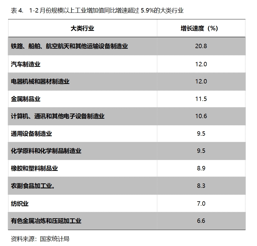 1-2月份,增長速度超過規模以上工業增長5.9%的主要大類行業共有11個,即鐵路、船舶、航空航天和其他運輸設備制造業增長20.8%,汽車制造業增長12.0%,電器機械和器材制造業增長12.0%,金屬制品業增長11.5%,計算機、通訊和其他電子設備制造業增長10.6%,通用設備制造業增長9.5%,化學原料和化學制品制造業增長9.5%,橡膠和塑料制品業增長8.9%,農副食品加工業增長8.3%,紡織業增長7.0%,有色金屬冶煉和壓延加工業增長6.6%。