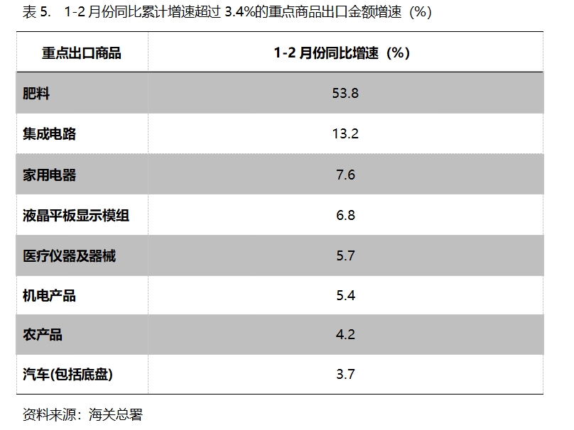 1-2月份,出口金額同比增速超過3.4%的重點商品共有8類,即肥料出口增長53.8%,集成電路增長13.2%,家用電器增長7.6%,液晶平板顯示模組增長6.8%,醫療儀器及器械增長5.7%,機電產品增長5.4%,農產品增長4.2%,汽車(包括底盤)增長3.7%。