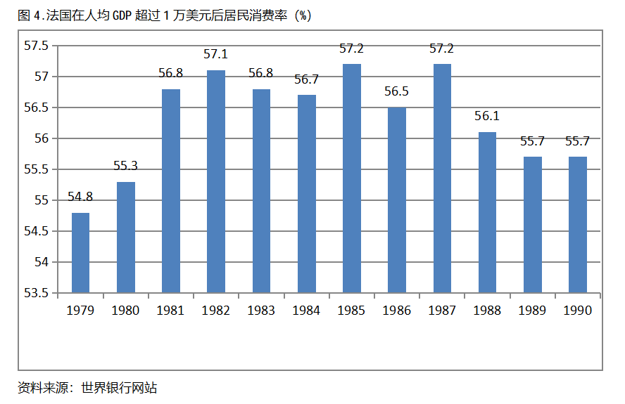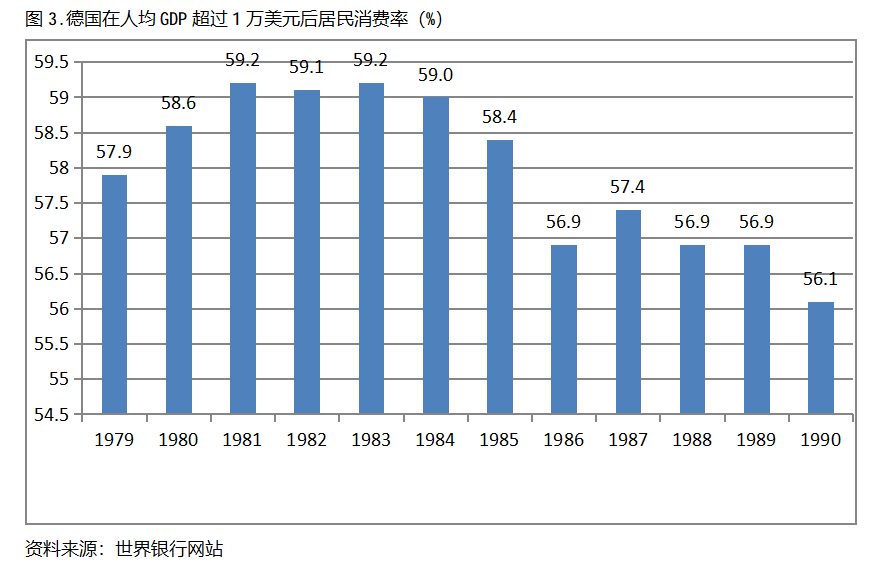 德國在人均GDP超過1萬美元后的12年期間,居民消費率一直保持在56.0%以上,同時還呈現出先提高后回落總體穩定的趨勢。德國在1979年人均GDP超過1萬美元,當年居民消費率為57.9%,1981年提高到59.2%,隨后又有所回落,1990年為56.1%,也就是說,德國在人均GDP超過1萬美元后的12年期間,居民消費率由當年的57.9%提高到1981年最高的59.2%,共提高了1.3個百分點。