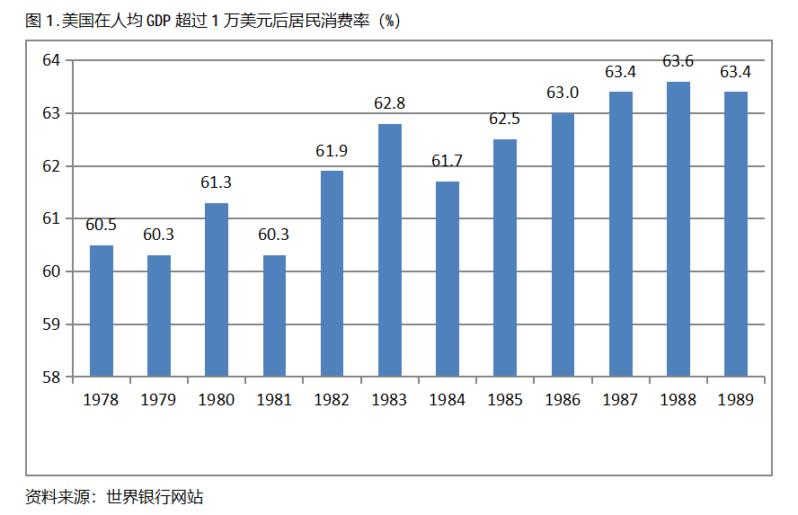 美國在人均GDP超過1萬美元后的12年期間注,居民消費率一直保持在60.0%以上,同時還呈現出總體持續提高的趨勢。美國在1978年人均GDP超過1萬美元,當年居民消費率為60.5%,此后總體保持了持續提高的態勢,12年后的1989年提高到63.4%,提高了2.9個百分點。