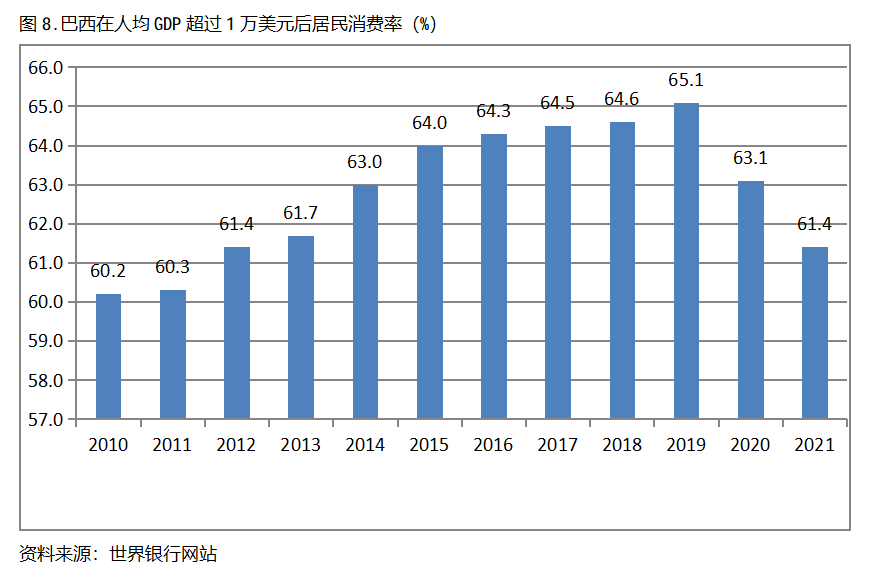 巴西在人均GDP超過1萬美元后的12年期間,居民消費率基本上保持在60.0%以上,也呈現出較長時間的提高,但后兩年也出現小幅的回落。巴西在2010年人均GDP超過1萬美元,當年居民消費率為60.2%,2019提高到65.1%,隨后兩年出現回落,2021年為61.4%,也就是說,巴西在人均GDP超過1萬美元后的12年期間,居民消費率由當年的60.2%提高到2019年最高的65.1%,共提高了4.9個百分點。