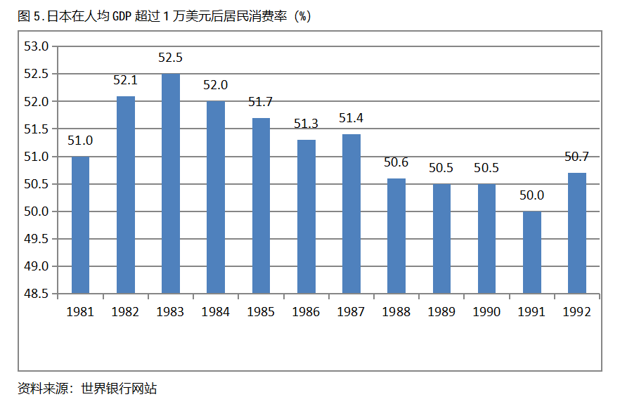 日本在人均GDP超過1萬美元后的12年期間,居民消費率一直保持在50.0%以上,同時也呈現出先提高后回落總體穩定的趨勢。日本在1981年人均GDP超過1萬美元,當年居民消費率為51.0%,1983提高到52.5%,隨后又有所回落,1992年為50.7%,也就是說,日本在人均GDP超過1萬美元后的12年期間,居民消費率由當年的51.0%提高到1983年最高的52.5%,共提高了1.5個百分點。