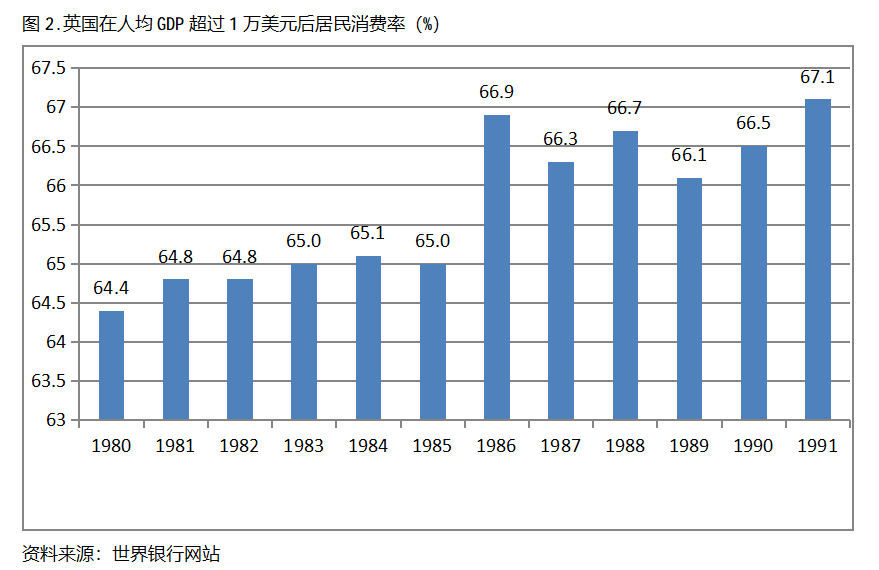英國在人均GDP超過1萬美元后的12年期間,居民消費率一直保持在64.0%以上,同時也呈現出總體持續提高的趨勢。英國在1980年人均GDP超過1萬美元,當年居民消費率為64.4%,此后總體保持了持續提高的態勢,12年后的1991年提高到67.1%,提高了2.7個百分點。