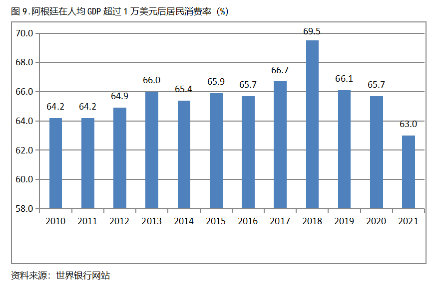 阿根廷在人均GDP超過1萬美元后的12年期間,居民消費率基本上保持在63.0%以上,也呈現出較長時間的提高,但后幾年也出現小幅的回落。阿根廷在2010年人均GDP超過1萬美元,當年居民消費率為64.2%,2018提高到69.5%,隨后兩年出現回落,2021年為63.0%,也就是說,阿根廷在人均GDP超過1萬美元后的12年期間,居民消費率由當年的64.2%提高到2018年最高的69.5%,共提高了5.3個百分點。