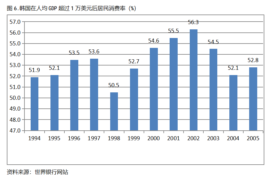 韓國在人均GDP超過1萬美元后的12年期間,居民消費率一直保持在50.0%以上,呈現出較長時間的提高,但后幾年出現小幅的回落。韓國在1994年人均GDP超過1萬美元,當年居民消費率為51.9%,2002提高到56.3%,隨后出現回落,2005年為52.8%,也就是說,韓國在人均GDP超過1萬美元后的12年期間,居民消費率由當年的51.9%提高到2002年最高的56.3%,共提高了4.4個百分點。