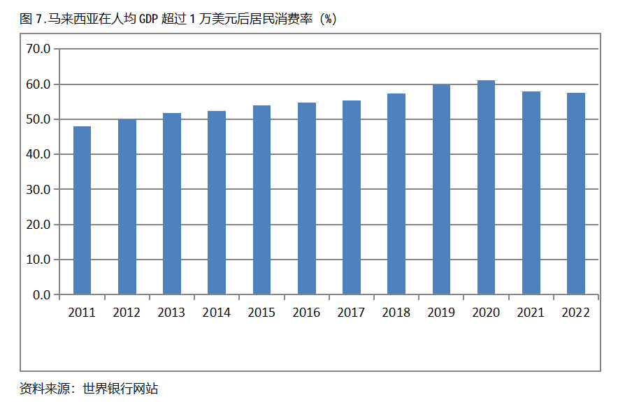 馬來西亞在人均GDP超過1萬美元后的12年期間,居民消費率基本上保持在50.0%以上,也呈現出較長時間的提高,但后幾年也出現小幅的回落。馬來西亞在2011年人均GDP超過1萬美元,當年居民消費率為48.0%,2020提高到61.0%,隨后出現回落,2022年為57.6%,也就是說,馬來西亞在人均GDP超過1萬美元后的12年期間,居民消費率由當年的48.0%提高到2020年最高的61.0%,共提高了13.0個百分點。