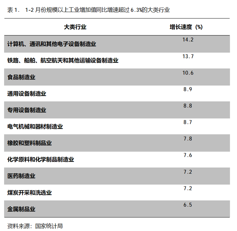 1-2月份,增長速度超過或持平規(guī)模以上工業(yè)增長6.3%的主要大類行業(yè)共有11個(gè),即計(jì)算機(jī)、通訊和其他電子設(shè)備制造業(yè)增長14.2%,鐵路、船舶、航空航天和其他運(yùn)輸設(shè)備制造業(yè)增長13.7%,食品制造業(yè)增長10.6%,通用設(shè)備制造業(yè)增長8.9%,專用設(shè)備制造業(yè)增長8.8%,電氣機(jī)械和器材制造業(yè)增長8.7%,橡膠和塑料制品業(yè)增長7.8%,化學(xué)原料和化學(xué)制品制造業(yè)增長7.6%,醫(yī)藥制造業(yè)增長7.2%,煤炭開采和洗選業(yè)增長7.2%,金屬制品業(yè)增長6.5%。