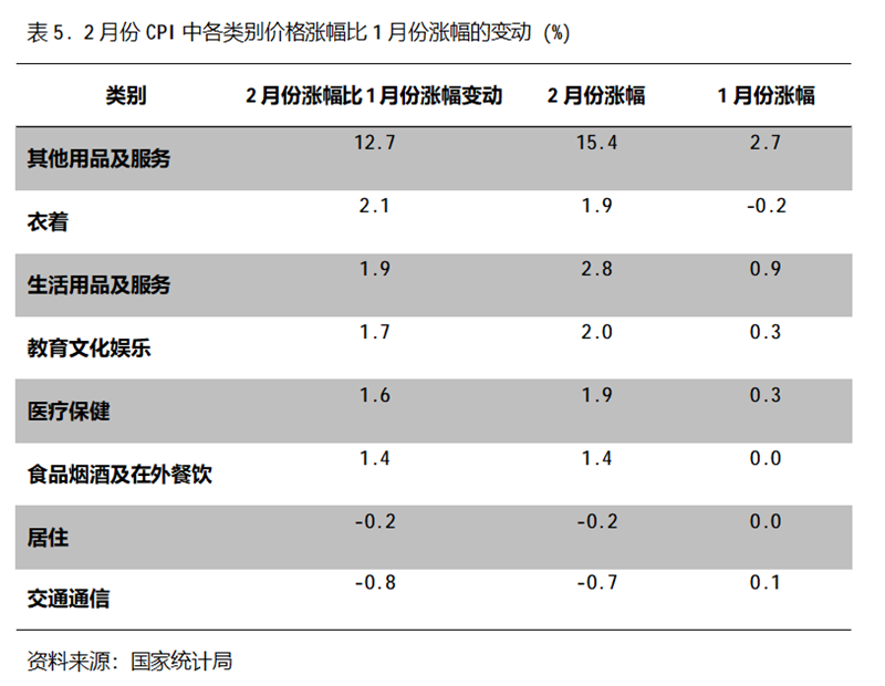 2月份,在CPI 8個(gè)類別中有6個(gè)類別同比漲幅回升,2個(gè)類別回落。漲幅回升的5個(gè)類別包括其他用品及服務(wù)漲幅回升12.7個(gè)百分點(diǎn),衣著由降轉(zhuǎn)漲、漲幅回升2.1個(gè)百分點(diǎn),生活用品及服務(wù)漲幅回升1.9個(gè)百分點(diǎn),教育文化娛樂漲幅回升1.7個(gè)百分點(diǎn),醫(yī)療保健漲幅回升1.6個(gè)百分點(diǎn),食品煙酒及在外餐飲價(jià)格由平轉(zhuǎn)漲、漲幅回升1.4個(gè)百分點(diǎn),居住由平轉(zhuǎn)降、降幅擴(kuò)大0.2個(gè)百分點(diǎn),交通通信由漲轉(zhuǎn)降、降幅擴(kuò)大0.8個(gè)百分點(diǎn)。