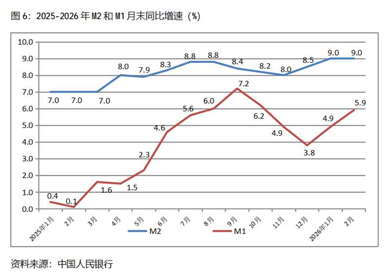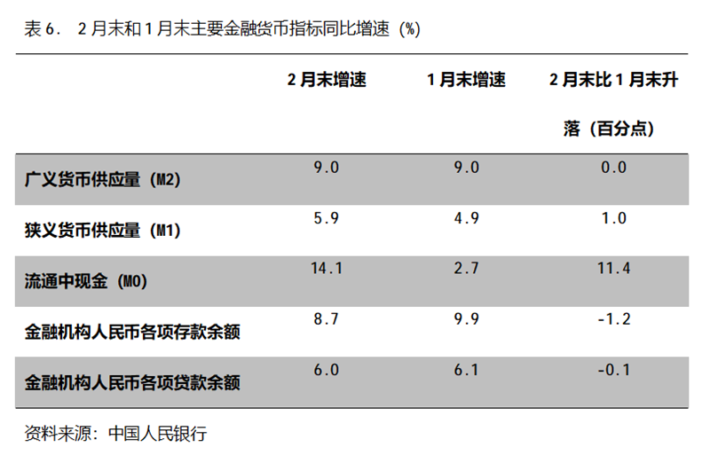 六、M2增速由升轉(zhuǎn)平。2月末,廣義貨幣供應(yīng)量(M2)同比增長9.0%,與1月份末增長9.0%持平,1月末增幅比上年末增長8.5%回升0.5個(gè)百分點(diǎn);狹義貨幣供應(yīng)量(M1)同比增長5.9%,比1月末增長4.9%回升1.0個(gè)百分點(diǎn),1月末增幅比上年末增長3.8%回升1.1個(gè)百分點(diǎn);流通中貨幣(M0)同比增長14.1%,比1月末增長2.7%回升11.4個(gè)百分點(diǎn),1月末增幅比上年末增長10.2%回落7.5個(gè)百分點(diǎn)。2月末,雖然M2增速與M1增速差距進(jìn)一步縮小,但仍還保持著不小的差距。