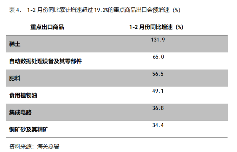 1-2月份,出口金額同比增速超過19.2%的重點(diǎn)商品共有6類,即稀土出口同比增長131.9%,自動(dòng)數(shù)據(jù)處理設(shè)備及其零部件增長65.0%,肥料出口增長56.5%,食用植物油增長49.1%,集成電路增長36.8%,銅礦砂及其精礦增長34.4%。