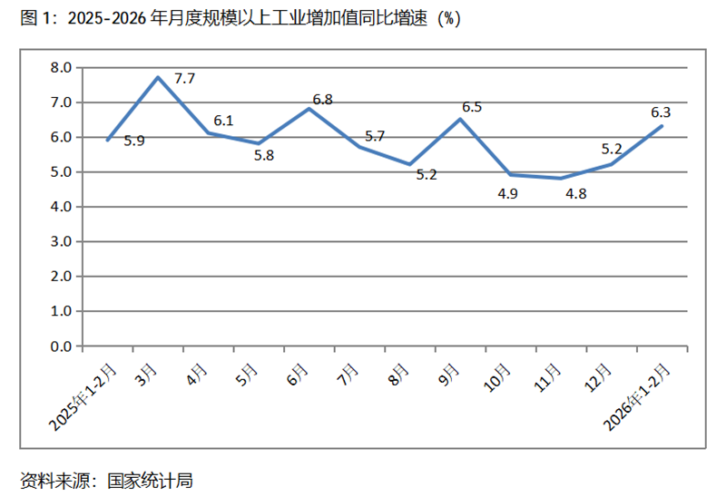 一、工業(yè)增速持續(xù)回升。1-2月份,規(guī)模以上工業(yè)增加值同比增長6.3%,比上年12月份增長5.2%回升了1.1個(gè)百分點(diǎn),上年12月份比上年11月份增長4.8%回升了0.4個(gè)百分點(diǎn)。從工業(yè)三大門類看,采礦業(yè)、制造業(yè)和電力、熱力、燃?xì)饧八a(chǎn)和供應(yīng)業(yè)增速比上年12月份全面回升,1-2月份,采礦業(yè)同比增長6.1%,比上年12月份增長5.6%回升0.5個(gè)百分點(diǎn);制造業(yè)增長6.6%,比上年12月份增長6.4%回升0.2個(gè)百分點(diǎn);電力、熱力、燃?xì)饧八a(chǎn)和供應(yīng)業(yè)增長4.7%,比上年12月份增長2.3回升2.4個(gè)百分點(diǎn)。