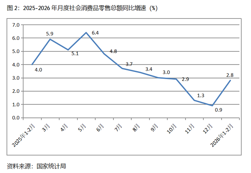 二、零售增速由落轉(zhuǎn)升。1-2月份,社會(huì)消費(fèi)品零售總額同比增長2.8%,比上年12月份增長0.9%回升了1.9個(gè)百分點(diǎn),上年12月份比上年11月份增長1.3%回落了0.4個(gè)百分點(diǎn),其中,餐飲收入和商品零售額增速均出現(xiàn)了回升,1-2月份餐飲收入同比增長4.8%,比上年12月份增長2.2%回升了2.6個(gè)百分點(diǎn);商品零售額增長2.5%,比上年12月份增長0.7%回升1.8個(gè)百分點(diǎn)。連續(xù)幾個(gè)月增速回落的社會(huì)消費(fèi)品零售總額增速出現(xiàn)了積極回升的苗頭。