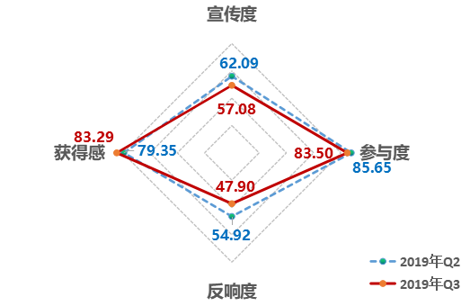 4、從維度來看,參與度、反響度有所下降,獲得感提升明顯。第三季度,宣傳度得分62.09,參與度得分85.65,反響度得分54.92,獲得感得分79.35。