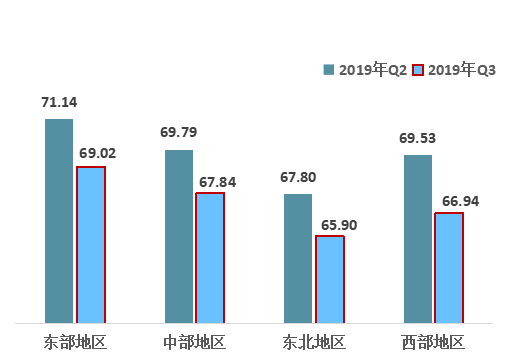 2.從四大區域來看,東部和中部地區繼續保持第一、第二,東北地區從上季度開始落后西部地區的情況沒有發生改變,而且差距呈擴大趨勢;