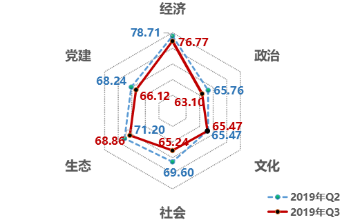 1、從領域來看,文化領域改革熱度值保持穩定,并首次超過社會領域。第三季度,經濟領域得分76.77,生態領域得分68.86,黨建領域得分66.12,文化領域得分65.47,社會領域得分65.24,政治領域得分63.10。