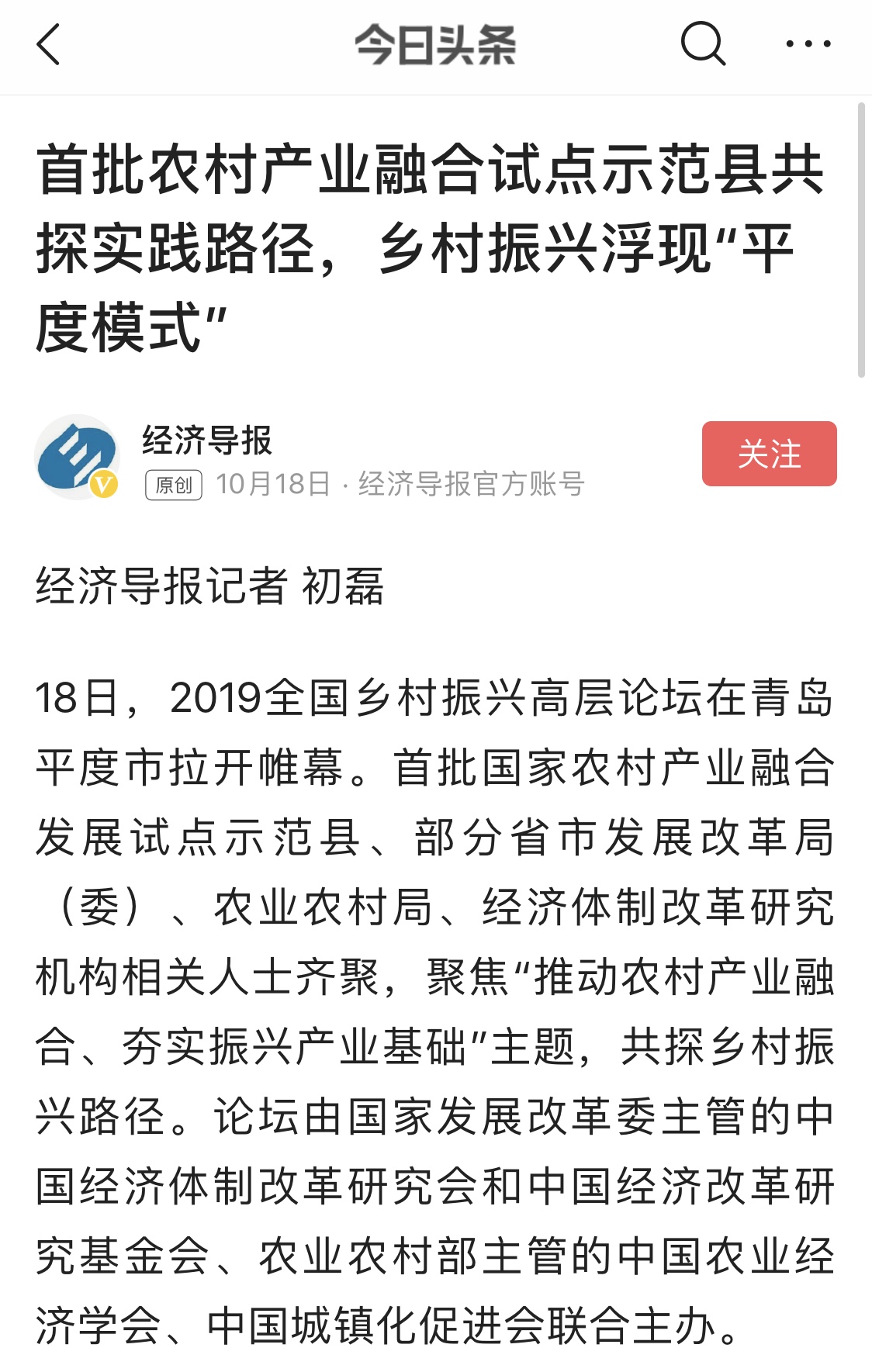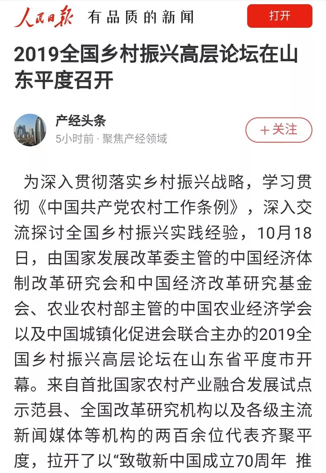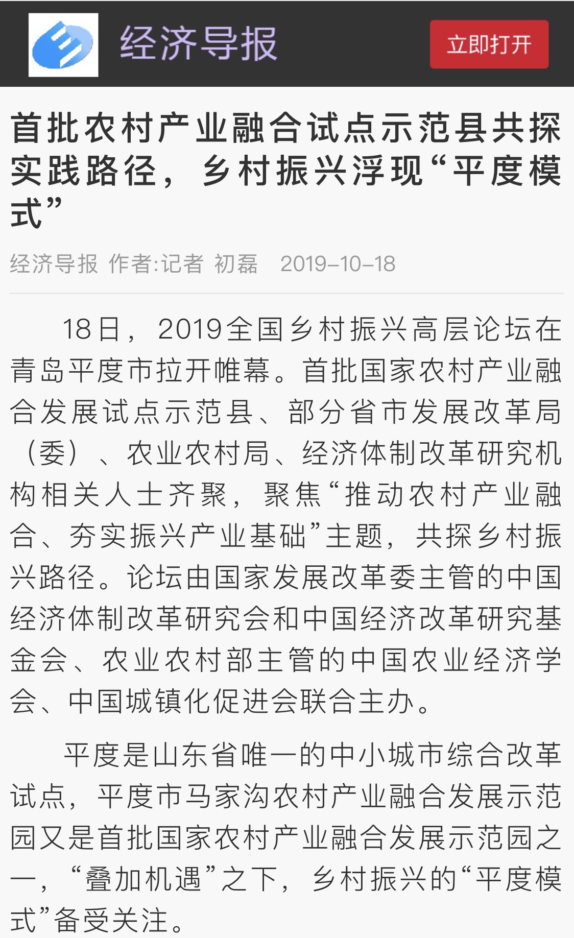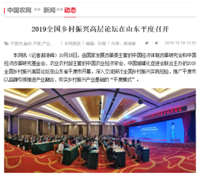 10月18日,中國經(jīng)濟體制改革研究會、中國農(nóng)業(yè)經(jīng)濟學會、中國經(jīng)濟改革研究基金會、中國城鎮(zhèn)化促進會聯(lián)合主辦的2019全國鄉(xiāng)村振興高層論壇在平度市開幕,開啟了以“推動農(nóng)村產(chǎn)業(yè)融合 夯實振興產(chǎn)業(yè)基礎(chǔ)”為主題的大討論。論壇上,中國經(jīng)濟體制改革研究會宣布把平度市列為博士后科研工作站調(diào)研基地,并授予平度“中國經(jīng)濟體制改革研究會博士后科研工作站調(diào)研基地”標牌。